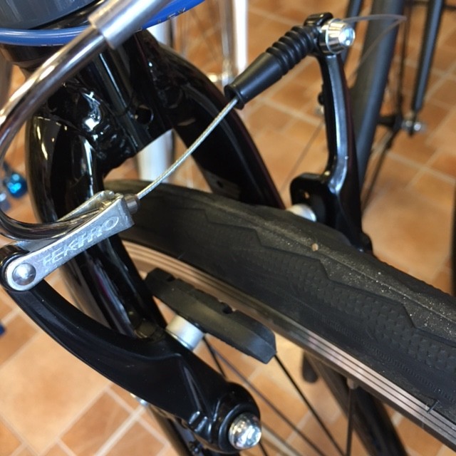 ブレーキはキャリパーブレーキ。TEKTRO製のVブレーキを使用しております。Vブレーキですと、制動力も有りますので安心です。