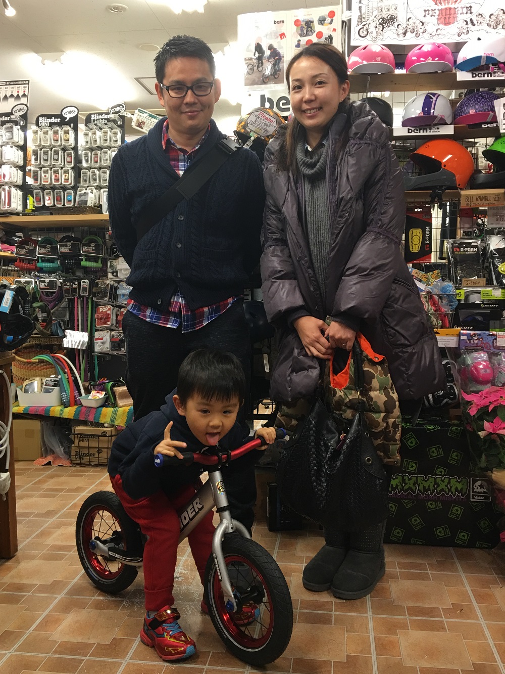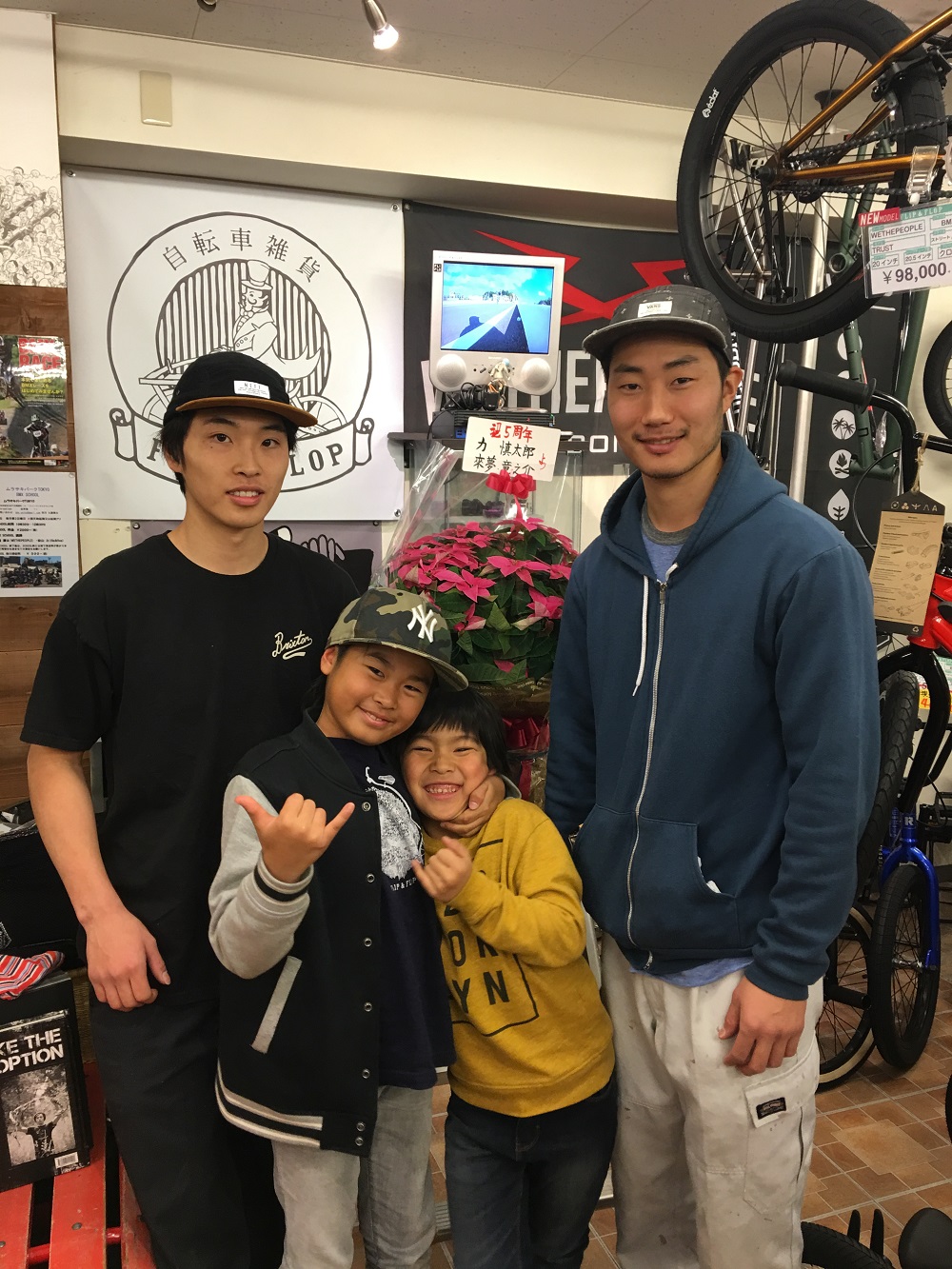 当店のBMXサポートライダーの力君、ライム、慎太郎君、とモンジ。
