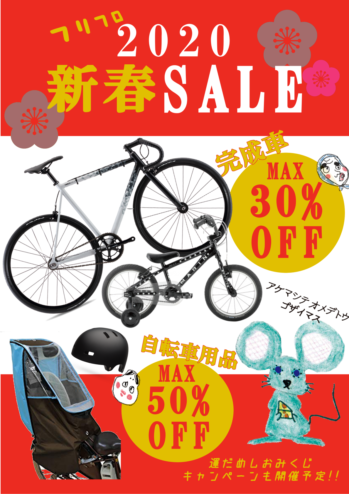 台数限定にはなってしまうのですが、人気のピストバイクからKIDS自転車まで、最大30%OFFに!! チャイルドシートカバーやそのほかの用品が一部限定でMAX50%OFFに!! そして2018年にご好評だった【運試しおみくじ】も開催予定です。 ※おみくじは2020年1月4日・5日の2日間のイベントです。